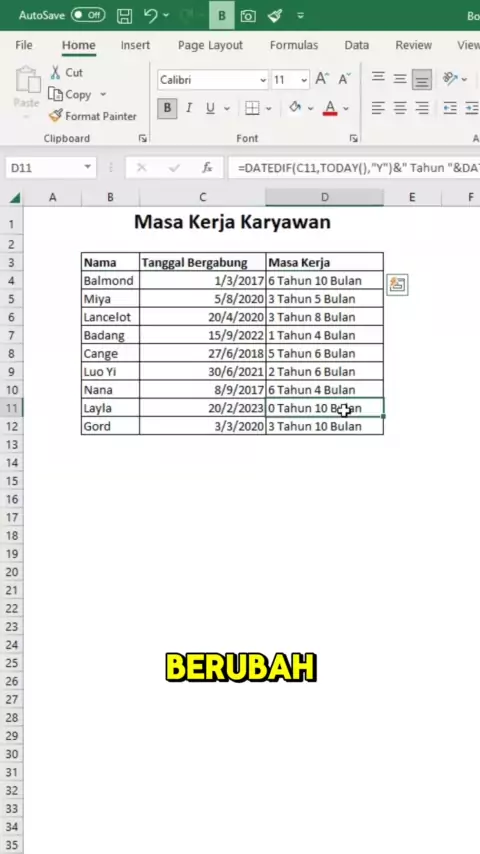 Baca Caption Biar Lebih Paham 🔥 Untuk menghitung Masa Kerja kita bisa gunakan formula DATEDIF Berikut adalah formula yg ada di video =DATEDIF(C4,TODAY(),"Y")&" Tahun " &DATEDIF(C4,TODAY(),"YM")&" Bulan" Kalau masih bingung silahkan DM ya #excel #excelindonesia #tipsexcel #levelup