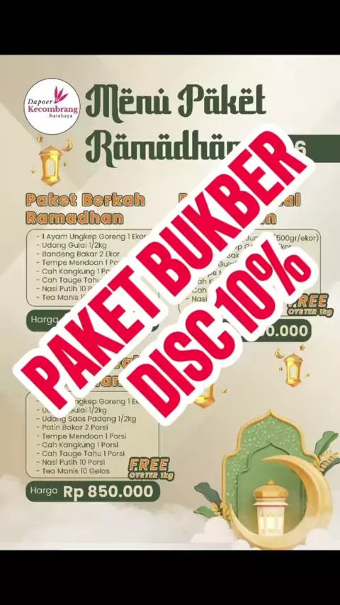 #creatorsearchinsights PAKET BUKBER HEMAT - DISC 10% LAGI, semakin hemat. BOOKING minimal 1 hari sebelum acaranya. Supaya ibadah puasa anda Mabrur, tentu saja berbukalah di tempat yang pasti Halal. Dapoer Kecombrang Surabaya sudah punya sertifikat Halal resmi dan asli serta musholanya kapasitas 20 orang ... DISCOUNT 10% dari nilai paket hanya sd 28 Februari 2026. Paket Buka Bersama untuk 10 orang I. Paket Rp. 650.000,- Ayam Ungkep Goreng 1 Ekor Udang Gulai 1/2kg Bandeng Bakar 2 Ekor Tempe M...