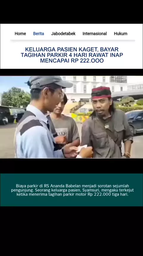 KELUARGA PASIEN KAGET, BAYAR TAGIHAN PARKIR 4 HARI RAWAT INAP MENCAPAI RP 222.OOO Biaya parkir di RS Ananda Babelan menjadi sorotan sejumlah pengunjung. Seorang keluarga pasien, Syamsuri, mengaku terkejut ketika menerima tagihan parkir motor Rp 222.000 tiga hari. Sementara itu, petugas parkir RS Ananda Babelan jelaskan bahwa besaran biaya tersebut merupakan perhitungan per jam selama tiga hari pasien dirawat.. Sc. 91tri