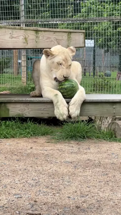 O leão come a melancia.