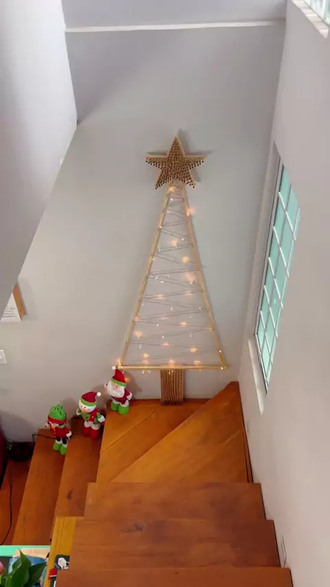 Ideia de Árvore de Natal simples e fácil de fazer, utilizei alguns pedaços de madeira, parafusos, cola instantânea e um pisca pisca. Gostou da ideia? #arvoredenatal #ideiasdenatal #decoracaonatalina