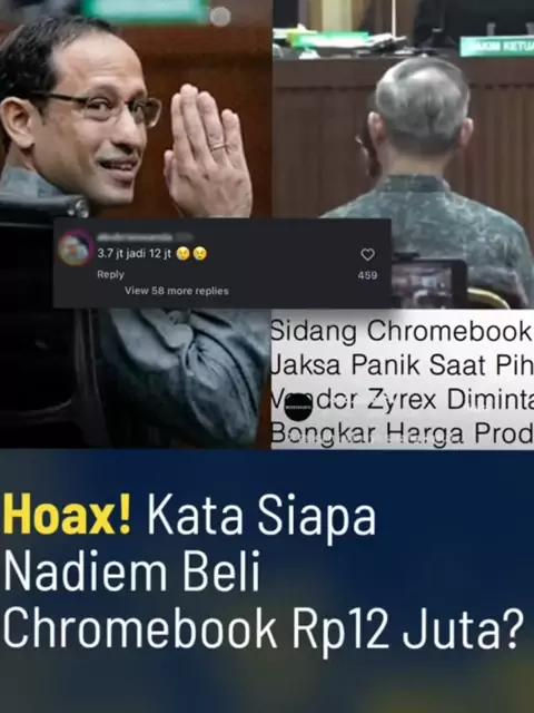 HOAX‼️‼️ Kata Siapa Nadiem Beli Chromebook Rp12 Juta❓❓ Sidang Chromebook, Jaksa Panik Saat Pihak Vendor Zyrex Diminta Bongkar Harga Produksi. Sudah jelas di persidangan, narasi Chromebook Rp12 juta itu nggak berdasar. Fakta di sidang menunjukkan harga yang masuk e-katalog adalah sekitar Rp5,5 juta setelah proses negosiasi resmi oleh LKPP. Jadi dari mana angka Rp12 juta itu muncul❓ Vendor bahkan membongkar struktur harga produksi di depan sidang. Ada biaya material, distribusi, margin wajar, sem...