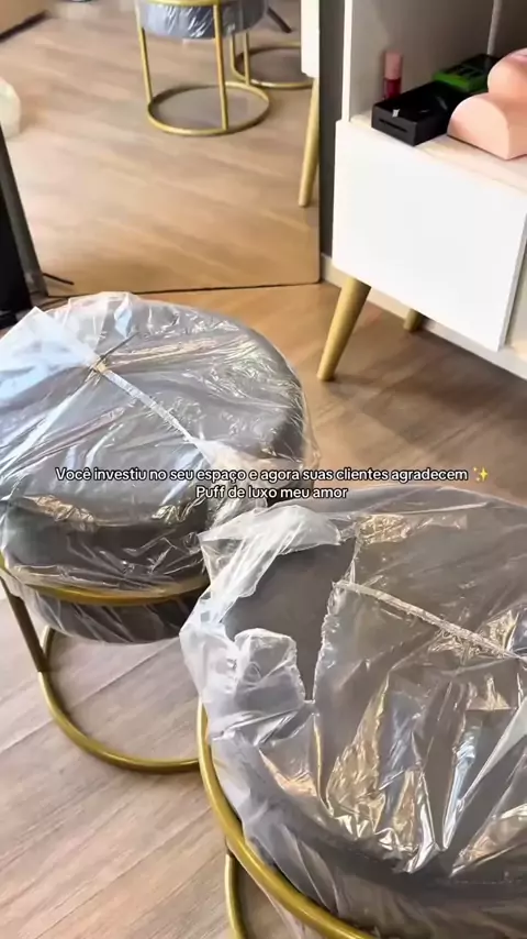 Puff Iron Base Ferro Argola Dourada Metalizada Suede Bege #puff #casaedecoracao