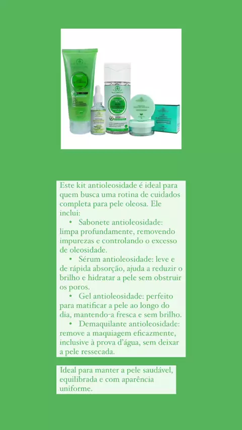 Este kit antioleosidade é perfeito para uma rotina completa de cuidados com a pele oleosa. Com limpeza profunda, hidratação leve e controle de brilho, ele garante uma pele fresca e equilibrada. #PeleOleosa #CuidadosComAPele #RotinaDeSkincare #Antioleosidade #SkincareDiário