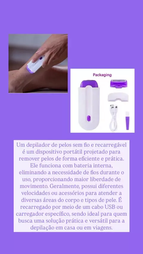 Um depilador de pelos sem fio e recarregável é um dispositivo portátil e prático que remove pelos de forma eficiente. Funciona com bateria interna, garantindo liberdade de movimento e versatilidade. Ideal para uso em casa ou viagens, é uma solução moderna para cuidados pessoais. #DepilaçãoPrática #CuidadosPessoais #SemFios #DepiladorRecarregável #PeleLisa