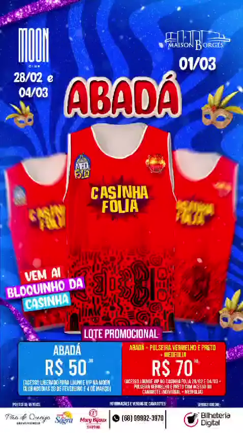 Abadá e Passaportes Para 3 Noites e 4 Festas do Carnaval 2025. 🎊🎉🎊🎉🎊🎉🎊 🪅 🎷28/02 Sexta na Casinha 🔎⚫01/03 Sábado na Maison (Direito a 🍲 Feijoada) 🎊🎉 01/03 Sábado Med Folia 🪅 🎷04/03 Terça na Casinha O Abadá é o Passaporte para as 4 Festas durante o Carnaval 2025 (REALIZAÇÃO) MEDFOLIA 🥳 & MOON CLUB🕋