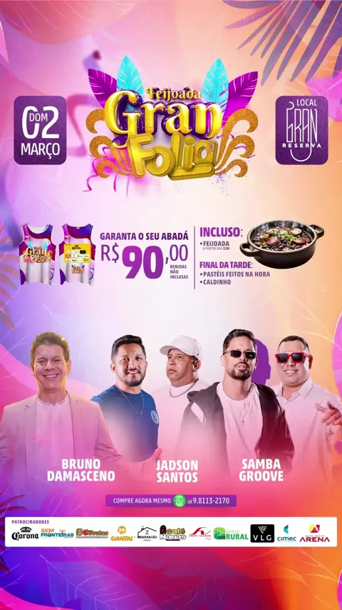 Domingo com Sabor e Música na Feijoada Gran Folia! … Garanta o seu abadá e aproveite um domingo incrível com feijoada, música ao vivo com Bruno Damasceno, Jadson Santos e Samba Groove, além de muita animação!🌟 … 📅 Data: 02 de março 📍 Local: Gran Reserva 💲 Valor: R$ 90,00 (bebidas não inclusas) … 🕒 Incluso: - Feijoada (a partir das 12h) Final da tarde: - Pastéis feitos na hora - Caldinho … 📲 Reserve já o seu abadá: WhatsApp (68) 9 8113-2170 … 🎭 Não fique de fora! 🌴