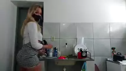 MC bandida de mini saia na cozinha