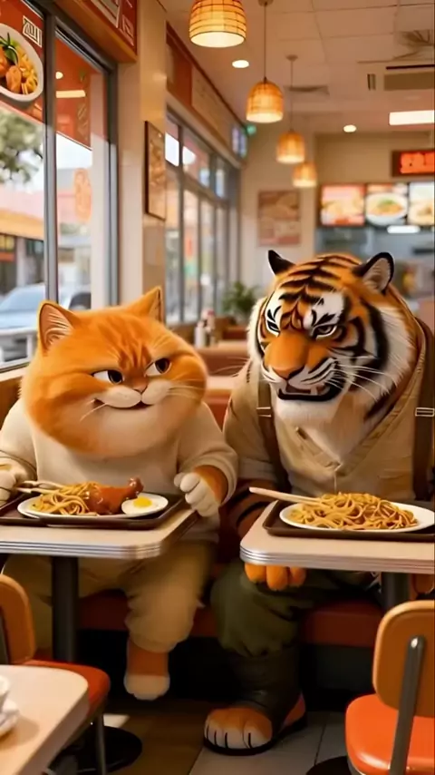 A very funny cat and tiger eating at a restaurant.##funnycat#funnytiger
