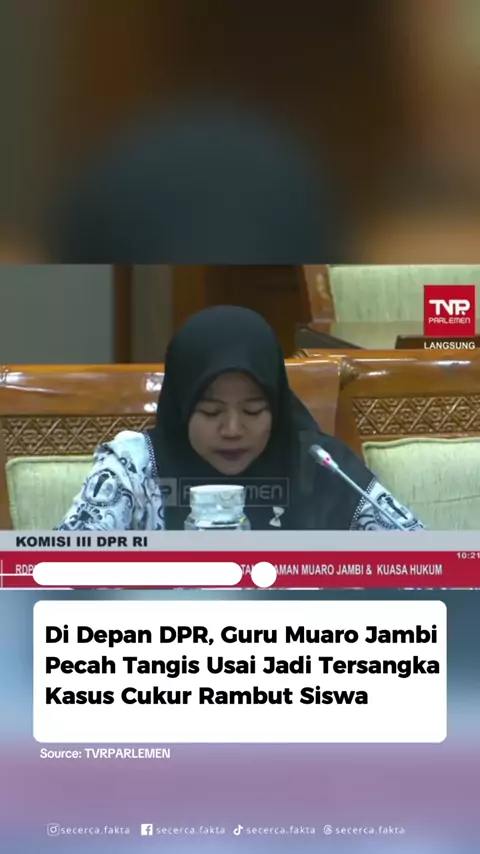 Seorang guru honorer di Muaro Jambi, Tri Wulansari, tak kuasa menahan tangis saat rapat dengar pendapat di Komisi III DPR RI. Ia menceritakan kronologi dirinya ditetapkan sebagai tersangka usai menertibkan rambut siswa yang dianggap melanggar aturan sekolah. Tri mengaku hanya berniat memotong sedikit rambut siswa. Namun setelah siswa tersebut berkata kasar, ia secara refleks menepuk mulut siswa itu. Peristiwa tersebut berujung pada proses hukum yang kini menjeratnya. SUMBER: RDP Komisi III DPR ...