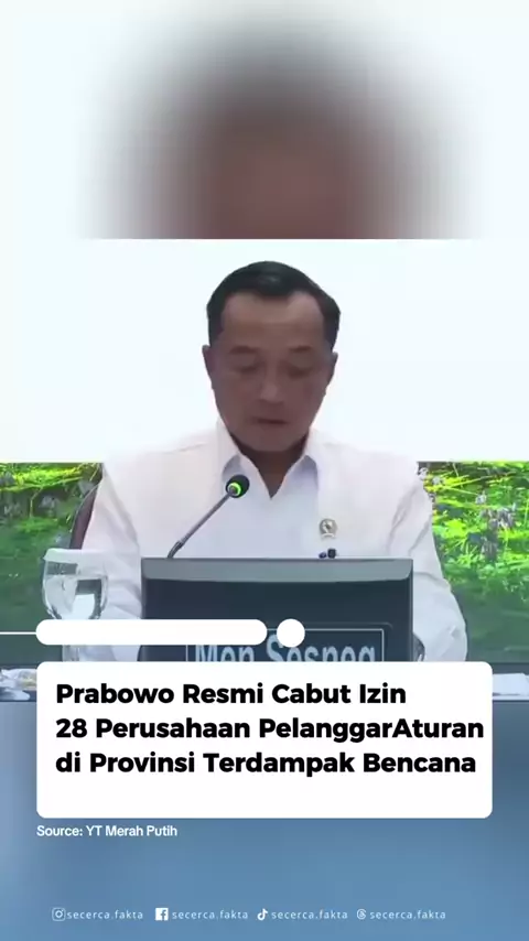 Presiden RI Prabowo Subianto resmi mencabut izin 28 perusahaan yang melanggar aturan pemanfaatan kawasan hutan di sejumlah provinsi terdampak bencana. Perusahaan-perusahaan tersebut beroperasi di Aceh, Sumatra Utara, dan Sumatra Barat. Keputusan pencabutan izin diambil usai rapat terbatas yang dipimpin Presiden Prabowo secara virtual dari London, Inggris, pada Senin (19/1). Dalam rapat tersebut, Satuan Tugas Penertiban Kawasan Hutan (Satgas PKH) memaparkan hasil investigasi terhadap perusahaan-...