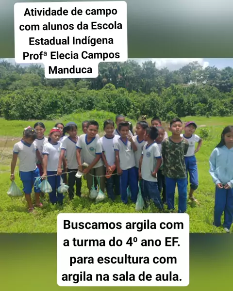 Atividade de campo com alunos da Escola Estadual Indígena Profª Elecia Campos Manduca de buscamos argila para fazer escultura na sala de aula.