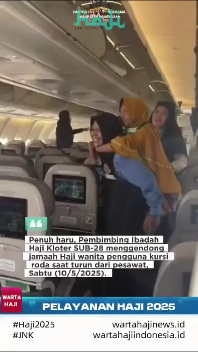 Penuh haru, pembimbing ibadah Haji Kloter SUB-28 menggendong Jamaah Haji wanita pengguna kursi roda saat turun dari pesawat #KemenagRI #Haji2025 #JNK #sorotan