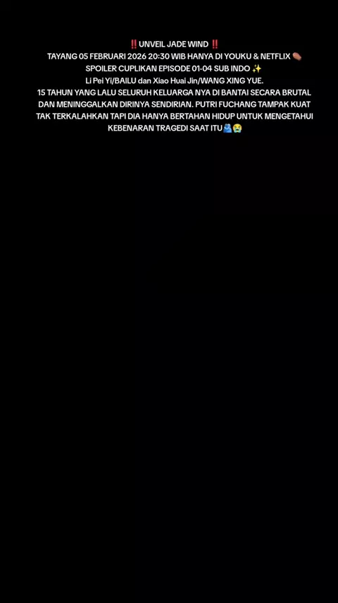 ‼️UNVEIL JADE WIND ‼️ TAYANG 05 FEBRUARI 2026 20:30 WIB HANYA DI YOUKU & NETFLIX ⚰️ SPOILER CUPLIKAN EPISODE 01-04 SUB INDO ✨ Li Pei Yi/BAILU dan Xiao Huai Jin/WANG XING YUE. 15 TAHUN YANG LALU SELURUH KELUARGA NYA DI BANTAI SECARA BRUTAL DAN MENINGGALKAN DIRINYA SENDIRIAN. PUTRI FUCHANG TAMPAK KUAT TAK TERKALAHKAN TAPI DIA HANYA BERTAHAN HIDUP UNTUK MENGETAHUI KEBENARAN TRAGEDI SAAT ITU🫂😭#2026 #UNVEILJADEWIND #BAILU #WANGXINGYUE #YOUKU