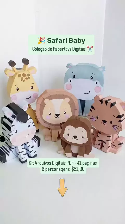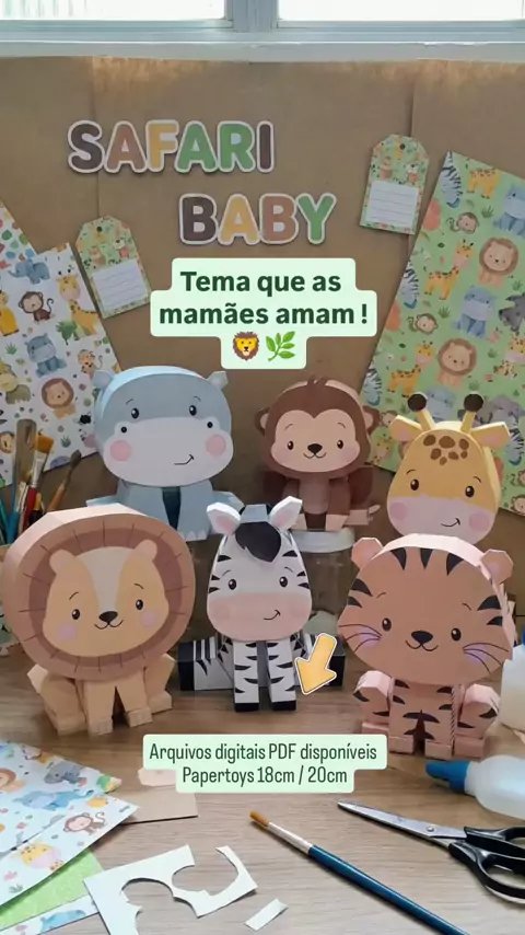 Coleção Safari baby Papertoys para você imprimir e montar em casa! ✂️🎉🌳 6 personagens: Leãozinho, zebrinha, macaquinho, girafinha, hipopótamo, tigrinho. Arquivo digital PDF 41 páginas Adquirir já seu kit digital Chama no direct! #safari #SafariParty #festasafari #festasafaribaby