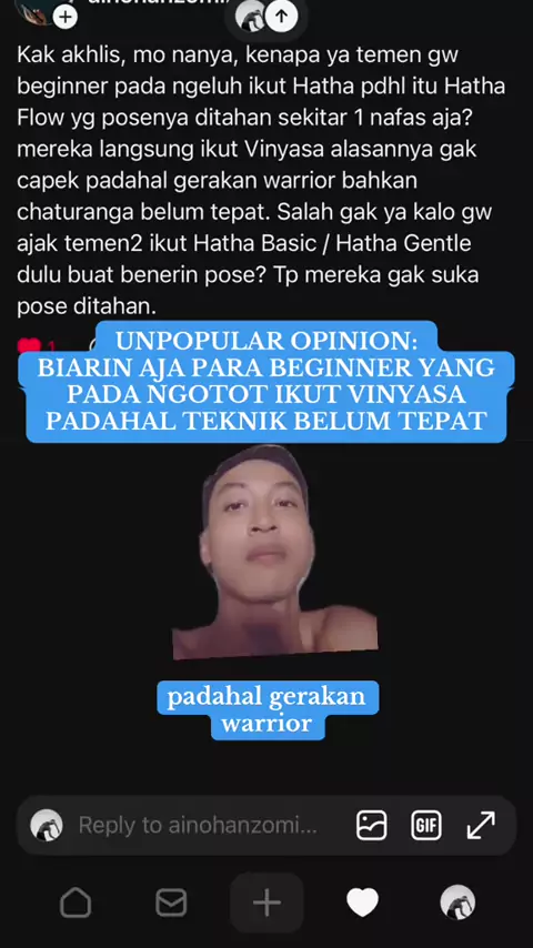 Ngajar yoga orang dewasa ada miripnya kok ngajar anak kecil. Kamu kadang nggak usah kasih nasihat ini itu. Biarin aja mereka dengan pilihan mereka lalu jika mereka mentok kena masalah cedera atau progress latihan nggak ada, baru mereka mau percaya😌 But let them realize they are wrong first. You cannot force them. 😇#hathayoga#vinyasayoga#tipsyoga#yogabeginnertips#chaturanga