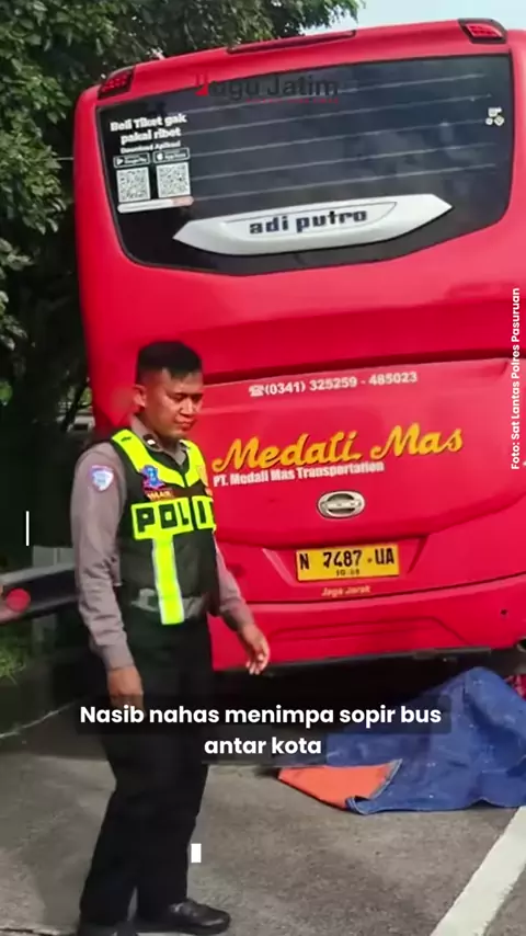 Sopir bus Moch. Sanalis t3w4s terl1nd4s kendaraannya karena lupa handrem saat memeriksa rem di kolong bus, di Tol Pandaan–Malang KM 56 A, Pasuruan, Senin (23/2/2026). Ikuti @tugujatimid untuk berita update di Jawa Timur.#tugujatim#tolpandaanmalang