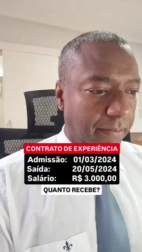 Neste vídeo consta a simulação do término do contrato de experiência correspondente ao valor bruto, bem como a simulação dos valores depositados na conta vinculada do FGTS. Sobre esses cálculos deverão incidir os descontos obrigatórios do INSS e IR (caso o valor da remuneração mensal ultrapasse o limite do valor da isenção do imposto de renda). ✅ CURTA e SIGA-ME. #rescisão #Trabalho #contratodetrabalho #direitodotrabalho