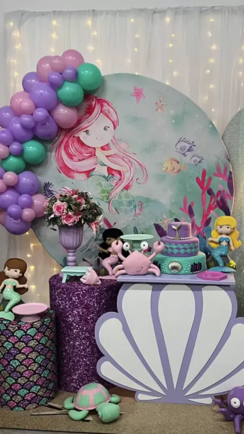 Vem ver a montagem de um modelo de kit pegue e monte com tema sereia 🧜🏻‍♀️🐚 Me conta aqui o que você achou 👇🏻 #festainfantil #decoracaodefesta #festasereia