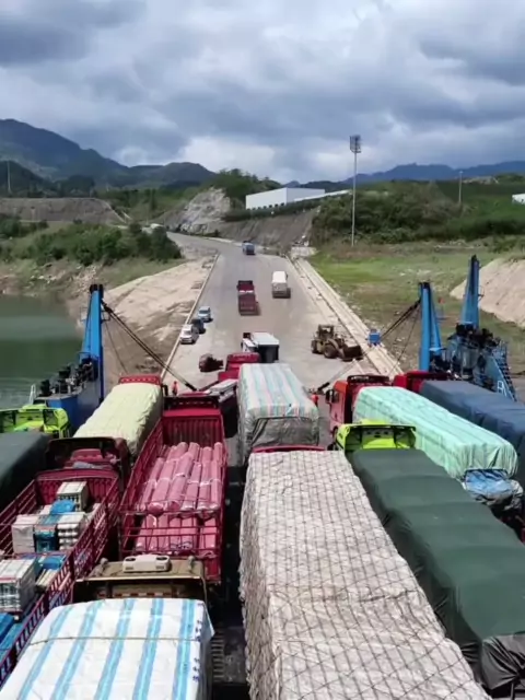Quarenta caminhões se alinharam para sair do navio.