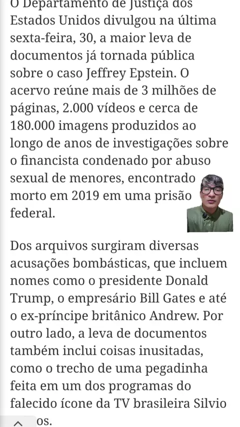 🚨Antes ele do que eu": A reação de Epstein a facada de Bolsonaro Os novos arquivos sobre o caso Jeffrey Epstein, divulgados no último dia 30 de janeiro, mostram uma conversa registrada em um chat entre o financista - que aparece com o nome borrado nos documentos - e o ex-estrategista-chefe da Casa Branca Steve Bannon, informa o site Gazeta do Povo. Assista ao vídeo do jornalista Vinícius Bellchior e saiba mais #BOLSONARO #epstein #brasil #noticias