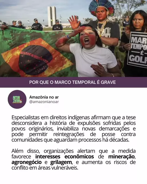 MARCO TEMPORAL O Senado pode votar nesta terça (9), a PEC do marco temporal, que limita a demarcação de terras indígenas às áreas ocupadas em 1988. A medida é considerada inconstitucional por especialistas e já foi rejeitada pelo STF em 2023. A votação acontece um dia antes de o Supremo julgar novamente o tema, aumentando a tensão entre os dois poderes. Arraste para o lado e saiba mais #AmazôniaNoAr #Marcotemporalnão #terrasindigenas
