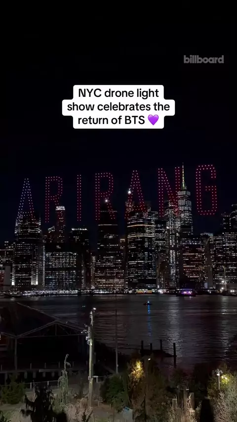 Que lindo, ARMY!😍 Um show de drones tomou conta do céu de Nova York para celebrar o retorno do BTS.💜 #arirang #armybts #btscomeback #bts #army