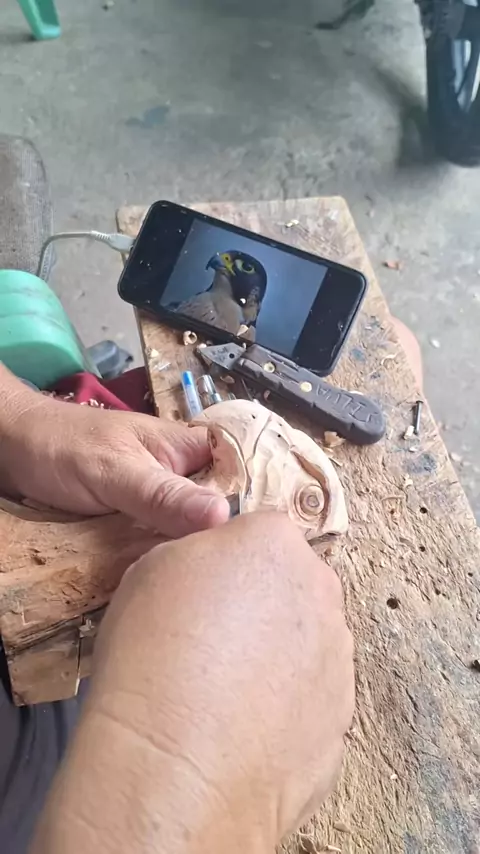 Início dos detalhes, cabeça de Falcão, esculpida em madeira umburana.#animais #animaisno #arte