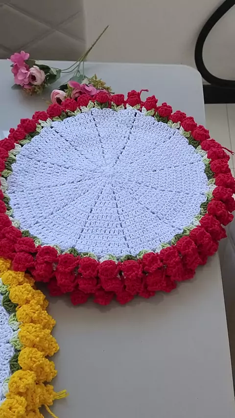 produรงรฃo maravilhosa desse suplast tulipa ๐ŸŒท jรก temos pronta entrega dessa lindeza em 3 cores disponรญveis. #viraliza #croche #feitoamรฃo #sousplat #artesa