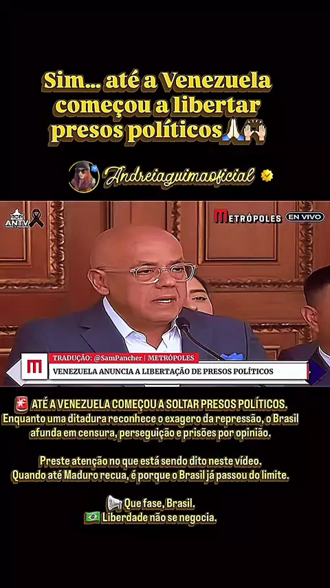 08/01/2026 Até a Venezuela anuncia libertação de presos políticos acusados de “atentar contra a democracia”. Enquanto isso, o Brasil segue no sentido contrário: censura, perseguição e presos por opinião. Quando até uma ditadura começa a recuar, é sinal de alerta máximo. 📢 Que fase, Brasil. 🇧🇷 @andreiaguimaoficial 🇧🇷