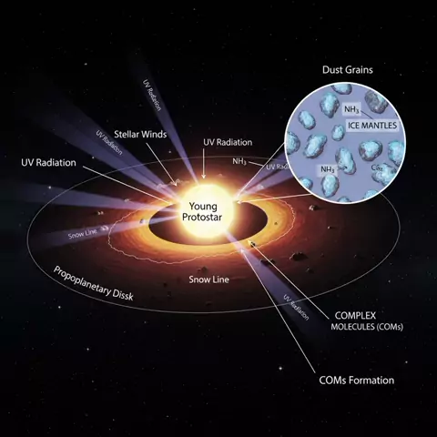 COSMOS NEWSAstronomia & Espaço Voltar A Jornada Cósmica da Vida: Moléculas Orgânicas Chegam a Júpiter 24 de fevereiro de 2026 · há 20 dias 141 visualizações 12 min de leitura 2.374 palavras Fonte original Compartilhar:WhatsAppTelegramTwitter/XCopiar link  Disco Protoplanetário e Formação de COMs Infográfico detalhado do disco protoplanetário, ilustrando a formação de moléculas orgânicas complexas (COMs) em mantos de gelo nos grãos de poeira sob irradiação UV.