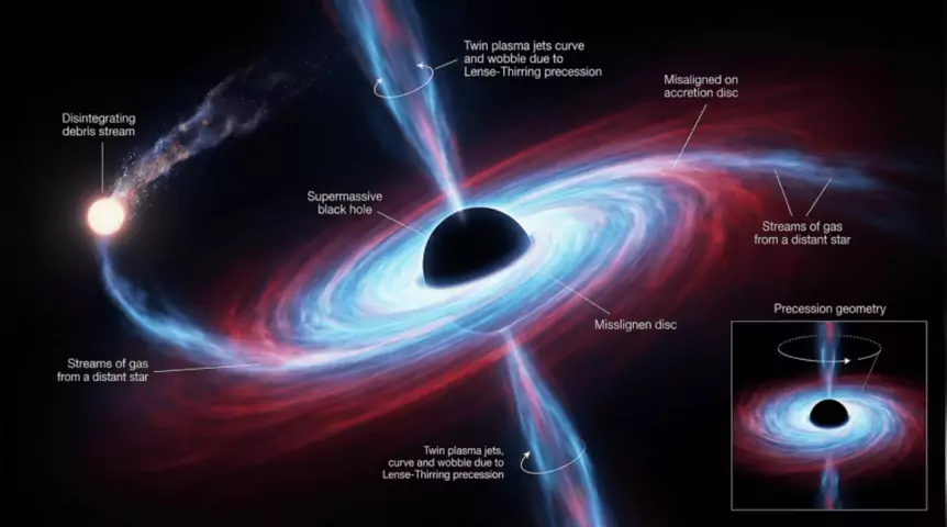 na revista Science Advances em dezembro de 2025 1, o estudo detalha como um buraco negro supermassivo, ao devorar uma estrela, exibiu um “bamboleio” rítmico e sincronizado em seu disco de matéria e nos jatos de partículas que expele. Esse comportamento, observado no objeto AT2020afhd, localizado a aproximadamente 400 milhões de anos-luz da Terra na galáxia LEDA 145386, fornece uma confirmação observacional robusta do efeito Lense-Thirring, uma consequência da Teoria da Relação relatividade.