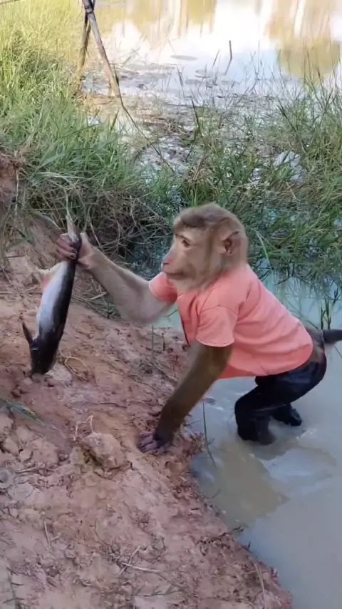 O macaco pegou um peixe grande.
