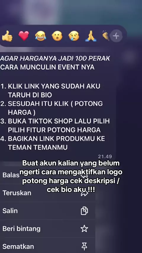 TUTORIAL MUNCULIN LOGO POTONGAN HARGA 100 PERAK : 1. Klik link yang sudah aku taruh di bio 2. Sesudah itu Klik potong harga 3. bakal muncul notif produk di paling bawah 4. Klik bagikan atau lihat produk buat cari yg lain 5. Pilih produk, klik bagikan share link ke teman kamu sampai harga jadi 100 p CATATAN : kalau mau bagikan lagi tapi gada fiturnya bisa tetap klik link yang tadi #masukberanda # #event #event100perak #event100perak