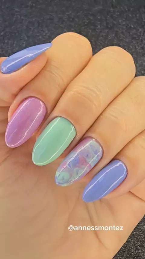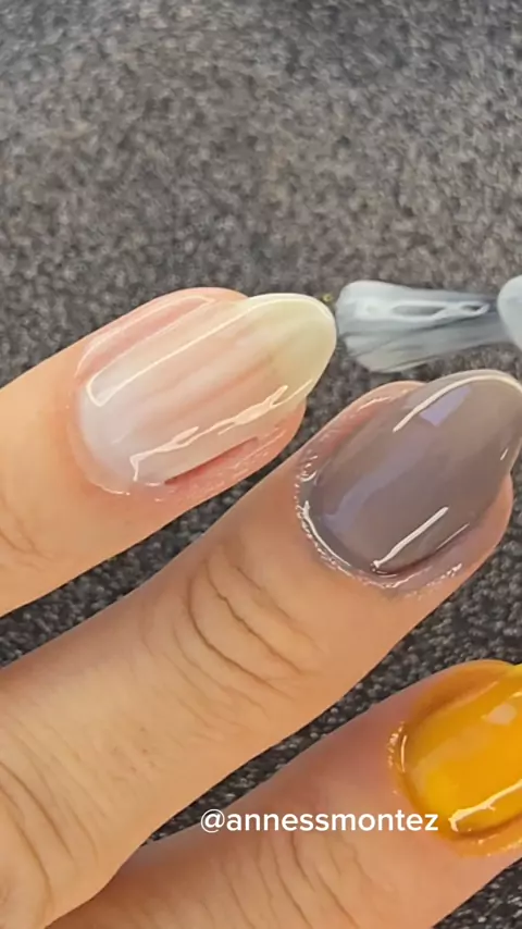 Unha curta marmorizada! Simples e delicada 🥰 Os esmaltes usados foram todos da @colorfashionesmaltes Dengo Camaleão Lenda #MeuPalpiteKwai #esmaltes #unhascurtas #cutilagem #Unhas