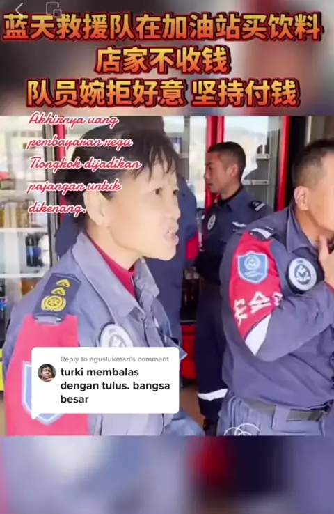 Replying to @aguslukman Tim Penyelamat Langit Biru membeli minuman di pom bensin di Turki, tetapi toko tersebut tidak memungut biaya.Anggota tim menolak tawaran tersebut dan bersikeras untuk membayar.#humanitarian#China#indonesia🇮🇩#education#turkey apa yg diajarkan warga Tiongkok cara membalas budi pada penyelamat mereka kini diikuti warga Turki!
