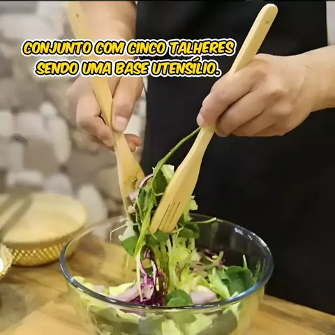 conjunto com cinco peças sendo quatro colheres e uma base utensílio.