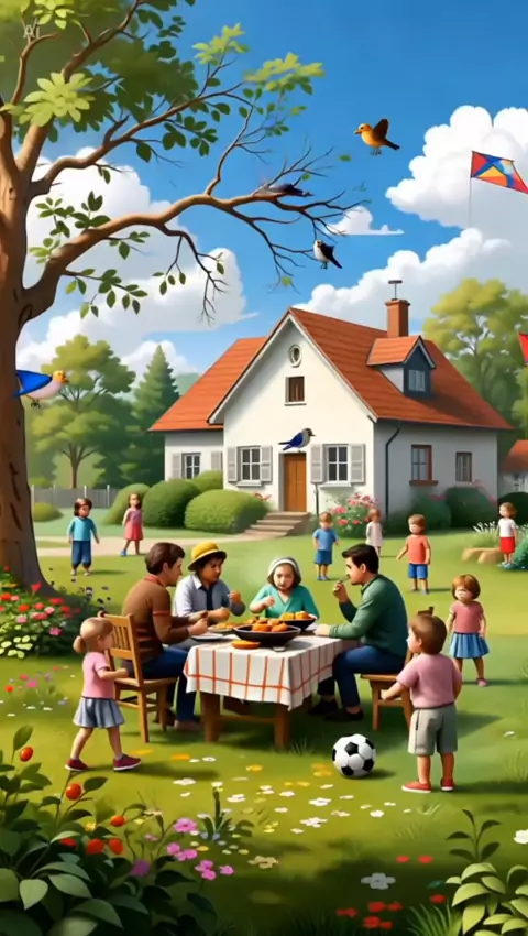 "Criançada correndo pela fazenda enquanto a família se delicia com um churrasco – risadas e cheirinho de comida boa no ar!"