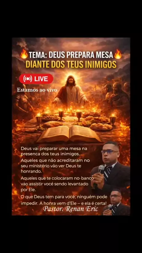 📳 Mensagem do dia 23/03/2026 - Segunda feira. 👑 Deus vai te honrar. 🔥 Tema: Deus prepara mesa diante dos teus inimigos 🔥 Deus está vendo tudo o que você passou em silêncio. As rejeições, o desprezo, as portas fechadas e até as “panelinhas” que tentaram te parar. Mas isso não foi o fim — foi preparação. 📖 Deus vai preparar uma mesa na presença dos teus inimigos. Aqueles que não acreditaram no seu ministério vão ver Deus te honrando. Aqueles que te colocaram no banco vão assistir você sendo l