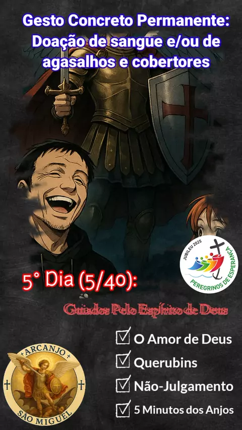 ”Somos os filhos da Esperança, e a Esperança é a alma do combate.” (Frei Ignacio Larrañaga, OFMCap) Combate da Esperança — Quaresma de São Miguel Arcanjo 2025 “Procurei o Senhor e Ele me atendeu, livrou-me de todos os temores.” (Sl 33[34],5) 5° Dia (5/40) — Guiados Pelo Espírito de Deus Conteúdo: https://www.facebook.com/share/v/1AmWqJzjpA/ #Jubileu2025 #PeregrinosDeEsperança #QuaresmaDeSãoMiguelArcanjo2025 #CombateDaEsperança #TITO