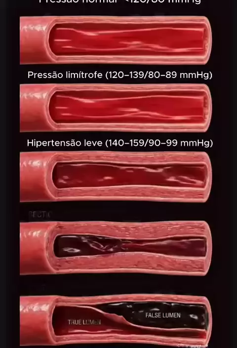 1. *Pressão normal*: <120/80 mmHg, artéria saudável. 2. *Pressão limítrofe*: 120-139/80-89 mmHg, início de estreitamento. 3. *Hipertensão leve*: 140-159/90-99 mmHg, estreitamento acentuado. 4. *Hipertensão grave*: ≥180/≥120 mmHg, estreitamento severo e dano. 5. *Dissecção arterial*: ruptura da artéria, criando um "falso lúmen". A hipertensão pode levar a complicações graves, como infarto ou AVC. 😊