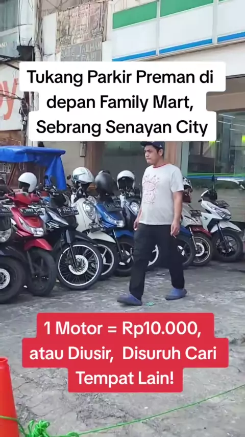 Tukang parkir di area parkir Family Mart, sebrang Senayan City, memaksakan tarif Rp10.000 utk 1 motor. Meskipun parkir cuma sebentar. Sikapnya arogan, uang Rp5000 dikembalikan dgn lagak meremehkan. Wajahnya berubah cengengesan setelah tau direkam video. Tapi tetao saja dia mengusir dan suruh cari parkir motor di tempat lain. Aksi premanisme dgn memaksa bayar tarif parkir seenaknya sendiri, bersikap seolah sbg pemilik lahan parkir, dan mengusir pengunjung Utk cari tempat parkir lain, tdk boleh d...