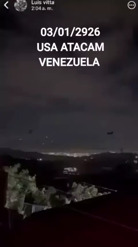 #GUERRA Helicópteros Chinook transportando forças especiais americanas e, ao fundo, explosões de ataques aéreos. Está decorrendo neste momento uma ação militar americana contra Caracas, capital da Venezuela, mas ainda não sabemos a extensão completa do ataque.