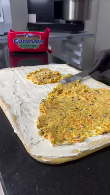 Receita 1 kilo de farinha de trigo 70 g açúcar 100 ml de margarina 20 g sal 10 g fermento biológico seco 500 ml de leite Uma pitada de orégano Recheio 800 g frango temperado e desfiado 100 g uva passa 1 lata de milho 1 maça picada 2 cenouras médias raladas 400 g requeijão cremoso coronata #_receitas #Salgado #rocambolesalgado