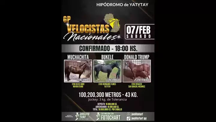 Muchachita vence GP Velocista Nacionales no Hipódromo de Yataytay Prova foi disputada nas distâncias de 100, 200 e 300 metros na tarde deste sábado Agora há pouco foi realizado o GP Velocista Nacionales no Hipódromo de Yataytay, reunindo competidores em disputas nas distâncias de 100, 200 e 300 metros. Na Raya 2 correu Bukele, na Raya 3 a égua Muchachita e na Raya 4 o cavalo Donal Trump. Após as baterias e a definição final da prova, Muchachita levou a melhor e garantiu o primeiro lugar.