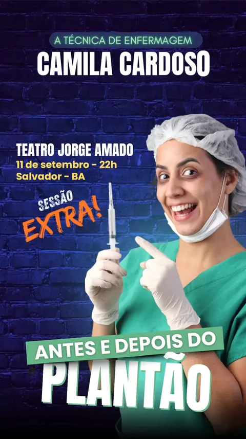 Salvador, vocês são incríveis! 💚 Todos os ingressos dos dias 10 e 11 já esgotaram! 🎭🔥 E como a galera pediu muito, abrimos sessão extra no dia 11 de setembro, às 22h, no Teatro Jorge Amado. 🚨 Os ingressos já estão quase esgotados também… então corre pra garantir o seu antes que acabe! 🏃‍♀️💨 #enfermagem #saude #humor #show
