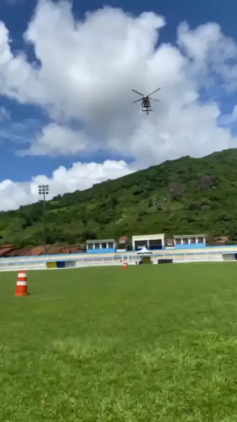 Helicóptero da Defesa Civil do Estado chegando em Uruburetama para levar alimentos e equipes de assistência às famílias em área isoladas em decorrência das chuvas no município. Vídeo: Marciano Vieira