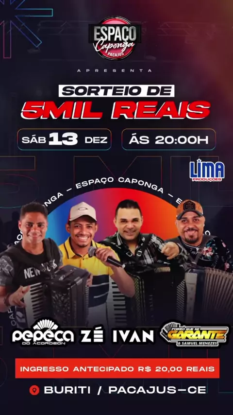 NATAL ANTECIPADO NO ESPAÇO CAPONGA! QUE TAL VOCÊ CONCORRER A 5 MIL REAIS E AINDA DANÇAR A NOITE TODA COM ZÉ IVAN, FORRÓ QUE SE GARANTE E PÊPÊCA DO ACORDEN?! - HÁ, ESSA É BOA! ENTÃO VEM PARA O ESPAÇO CAPONGA! DIVERSÃO A NOITE TODA! É NESTE SÁBADO DIA 13 DE DEZEMBRO A PARTIR DAS 8 DA NOITE, NO ESPAÇO CAPONGA, BURITI PACAJUS, NA RUA TABELIÃO JOSÉ GAMA FILHO! VOCÊ VAI CONCORRER AO SOTEIO DE 5 MIL REAIS! BOA SORTE! #augustocesardebemcomavida #radiotopwebetudodebom #espacocaponga