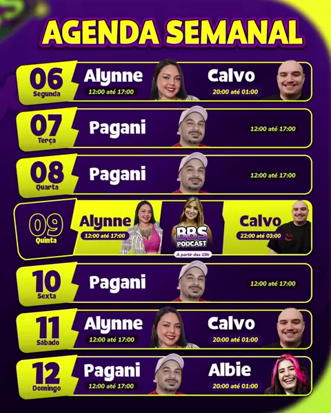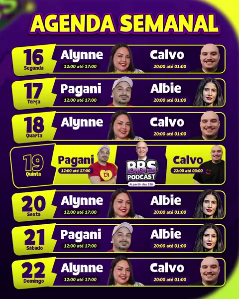 Agenda da Semana na telinha! Quinta o BBS Podcast segue IMPERDÍVEL com a presença do CRO e Co-Fundador na Dale Academy, Ricardo Destaole. Nossos hosts Batata e Bonfá já estão prontos para esse momento, e você? Lives diárias com nossos streamers aguardando a boa! Pagani, Alynne, Calvo e Albie prontíssimos pra receber a call. Bora? Acompanhe a programação ao vivo! Link na Bio! 🔞 Conteúdo destinado apenas a maiores de 18 anos ⚠ Estabeleça e respeite seus limites. Jogue com responsabilidade.