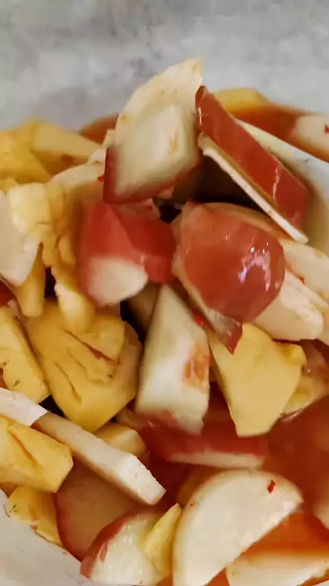 Asinan. Asem, manis, pedas, seger banget. Simpan semalaman di chiller agar rasanya makin enak. Dinikmati dingin-dingin, enak banget. Bahan: 1 buah cabe merah besar 15 buah cabe merah keriting 5 cabe rawit merah 700 ml air ½ sdt garam 2 sdt terasi bakar 2 sdt ebi (rendam di air panas, tumbuk, sangrai) 200 g gula pasir 10 buah jeruk sonkit peras Nanas Bangkuang Jambu merah Kacang tanah goreng#asinan#asinanbuah#buah#asinanbogor